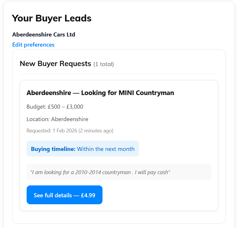 You’ll see the MINI model they want, their budget range, location (city or postcode area), buying timeline, and any notes they’ve added. Contact details are revealed after payment.